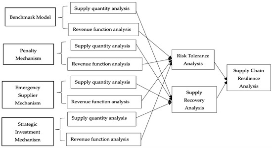 In the operation process of the supply chain, there are many emergency situations that cause the supply chain to face the risk of supply interruption. At the same time, due to the different production recovery capabilities of the supplier, the degree of interruption risk presented by the supply chain varies when encountering the same unexpected event. In order to better cope with supply interruption with different risk characteristics, this paper constructs a secondary supply chain consisting of one supplier and one manufacturer and studies the risk tolerance and supply recovery ability of the supply chain when three risk coping strategies are adopted, namely the default penalty mechanism, emergency supplier mechanism, and strategic investment mechanism to solve the problem of strategy selection under different levels of supply interruption risk, thereby improving the resilience of the supply chain. Among them, supply chain resilience is reflected by the supply chain’s risk tolerance and supply recovery capability from supply interruption risk. We construct a benchmark model of the manufacturer not adopting a risk coping strategy, a risk coping strategy model based on a default penalty mechanism, a risk coping strategy model based on an emergency supplier mechanism, and a risk coping strategy model based on a strategic investment mechanism to maximize the profit of the supplier and manufacturer and risk tolerance of supply chain after supply interruption. That is, the difference between the manufacturer’s profit when there is no supply interruption and when there is supply interruption is minimized. We calculate the optimal values of each decision variable, and the risk-coping strategy models are verified to have better tolerance for supply interruption risk than the benchmark model. Furthermore, comparative analyses were conducted on various models to investigate their role in enhancing supply chain resilience. Finally, the parameters were assigned, and an example analysis was conducted to validate the model analysis results and demonstrate the changes in risk tolerance at different parameter levels.