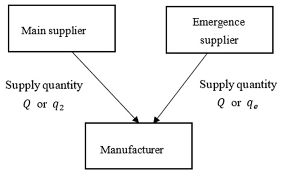 In the supply chain system composed of a supplier and manufacturer, the unit purchase price of the manufacturer is . If there is no supply interruption, the supplier’s supply to the manufacturer is the purchase amount agreed in the procurement contract between the two parties, that is , and the manufacturer sells the final product to the downstream consumer market. It is set that each unit of the final product requires one unit of procurement raw materials. The number of products put into the market by the manufacturer is the purchase amount , and the total demand in the downstream market is . The relationship between the unit sales price and the total market demand satisfies the inverse demand function [28,29]. If there is a supply interruption, the supplier’s supply quantity to the manufacturer is . When adopting an emergency supplier strategy, the manufacturer’s procurement quantity from the emergency supplier is . In addition, this study sets the manufacturer’s other costs, except for procurement costs, that are standardized at zero [30].