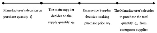 The decision variables of the manufacturer are the agreed procurement quantity in the procurement contract between both parties and the total procurement quantity from the emergency supplier in the event of a supply interruption. The decision variable of the supplier is the total supply quantity to the downstream manufacturer due to supply interruption. The decision variable for the emergency supplier is the unit purchase price that was provided to the manufacturer. This decision-making order is not lacking in generality and has been explored in the research by Zeng Nengmin et al. [29]. The sequence of decisions is shown in Figure 5.