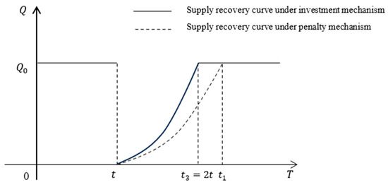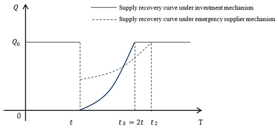 , which can be seen as a function of time , can be used to obtain the supply recovery curve, as shown in Figure 9. It can be seen from the figure that if , the supply chain supply interruption risk is characterized by high risk. And when the strategic investment mechanism is adopted, the time required for the supply chain to recover to the level before the interruption is shorter than that required for recovery when the emergency supplier mechanism is adopted, which can enable the supply chain to recover to the level before the interruption quickly, and has strong supply interruption recovery ability. When the emergency supplier mechanism is adopted, the recovery time is long, and the ability to recover from supply interruption is weak.