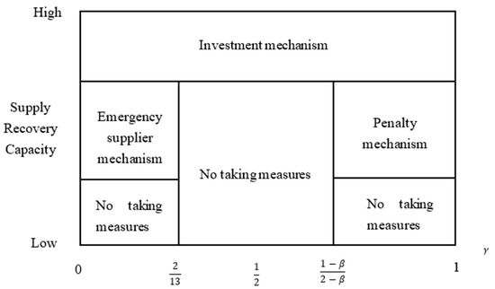 Taking the maximization of the manufacturer’s revenue as the decision-making goal, when among the strategies that the manufacturer can choose, the supply chain with the strategic investment mechanism has the strongest supply interruption supply recovery ability, which is better than the emergency supplier mechanism. And when , among the strategies that the manufacturer can choose, the supply chain with the strategic investment mechanism has the strongest supply recovery ability, which is better than the penalty mechanism.
