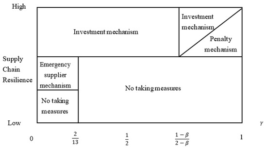 Corollary 3 indicates that when the supply chain’s supply interruption risk is characterized by low risk, the manufacturer adopting the strategic investment mechanism and the penalty mechanism will increase the supply chain’s resilience. The strategy choice depends on the kind of cooperation relationship the manufacturer expects to establish with the supplier. When the risk of interruption is characterized by high risk, both the strategic investment mechanism and emergency supplier mechanism adopted by the manufacturer can increase the supply chain’s resilience, and the ability to improve resilience is stronger when a strategic investment mechanism is adopted. When the interruption risk characteristic is moderate, the manufacturer adopting a strategic investment mechanism can improve the supply chain’s resilience. Thus, the conclusion shown in Figure 11 is obtained.