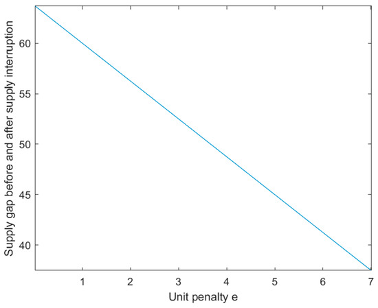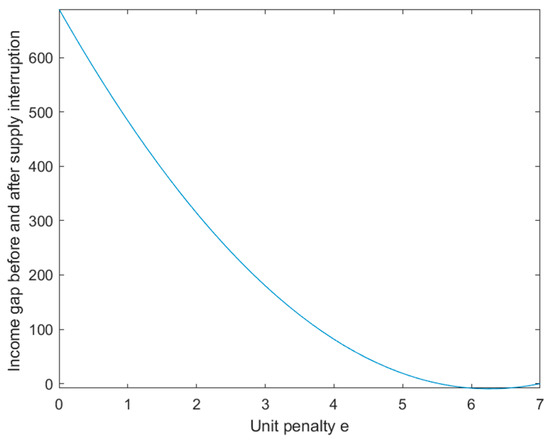 Researching the ability to deal with supply interruption risk using penalty strategies first requires determining the optimal unit penalty , which minimizes the difference in manufacturer’s revenue between when a supply interruption occurs and when it does not. As shown in Figure 12, under the specified parameter values, when 7, , at which point the difference in supply quantity before and after the interruption is 0, i.e., the maximum value of unit penalty e is 7, and the difference in the manufacturer’s revenue is 0. As shown in Figure 13, there exists an optimal value , such that the manufacturer’s revenue after a supply interruption surpasses the manufacturer’s revenue under normal circumstances. If a penalty strategy is chosen to address the supply interruption risk, the manufacturer typically sets the unit penalty as . This allows them to maximize their revenue in the event of a supply interruption while also mitigating the risk. Furthermore, in determining the optimal unit penalty, it is important to consider factors such as the likelihood of the supply interruption and the impact of the interruption on the manufacturer’s operations. By carefully analyzing these factors, the manufacturer can develop a penalty strategy that enhances their ability to manage supply interruption risk effectively.