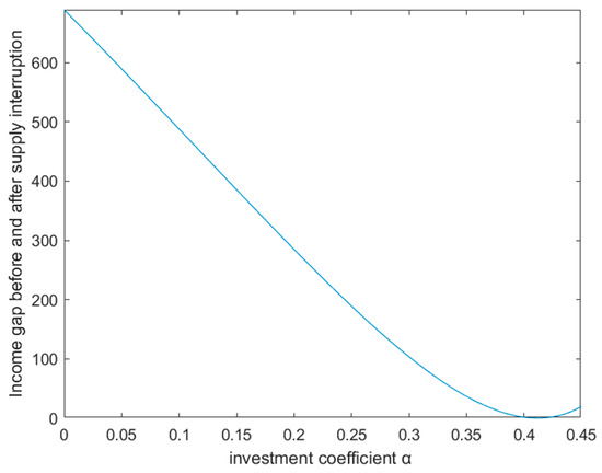 The research on the ability to cope with supply disruption risk using a strategic investment strategy first requires determining the optimal investment coefficient value. As shown in Figure 14, there exists an optimal value α that minimizes the difference in the manufacturer’s profit before and after the supply disruption, and at this time, . If the strategic investment strategy is chosen to cope with supply disruption risk, the manufacturer usually sets the investment coefficient to .