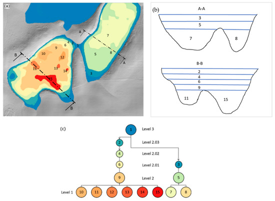Nested depressions structure: (a) plan view; (b) cross-sectional views; and (c) hierarchical tree, representing the intermediate-level depressions with specific colours and the corresponding filling level for the bottom-up flooding phase indicated with numbers [26].