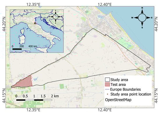 The study area is situated in the drainage plain of the Pisciatello stream, in the province of Forlì-Cesena, Northern Italy. This triangular-shaped area covers a total of 1352 hectares, as shown in Figure 2. It is located within the municipality of Cesenatico, and it is positioned near the Adriatic Sea. The Pisciatello stream runs along the southern border of the study area, while the northern border aligns with the embankment of state road SS304. The municipality of Cesenatico is seeking cost-effective tools for conducting high-resolution flood hazard modelling and mapping to develop a more secure and sustainable urban planning strategy. This objective serves as the original motivation for testing the capabilities of Safer_RAIN in this context. We evaluate the performance of Safer_RAIN relative to the 2D hydrodynamic model available within the HEC-RAS modelling environment [46].