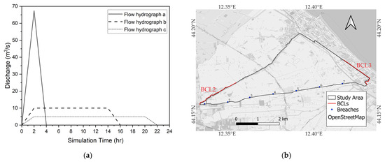 (a) Inflow hydrographs used for simulating breaches with HEC-RAS. (b) The overall study area indicating location of synthetic breaches and outlet boundary condition lines (BCLs).