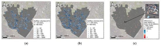 (a) Outflow volumes from drainage system as modelled by MM Spa for 90 min rainfall events associated with 20 years return period. (b) Outflow volumes from drainage system as modelled by MM Spa for 90 min rainfall events associated with 100 years return period. (c) Differences between water depths simulated by Hydro_AS-2D (after 300 min) and Safer_RAIN for 100-year return period.