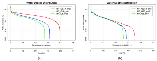 (a) Maximum water depth distribution between HR_Q67.4 and HR_Q10 simulations. (b) End water depth distribution between HR_Q67.4 and HR_Q5 simulations.