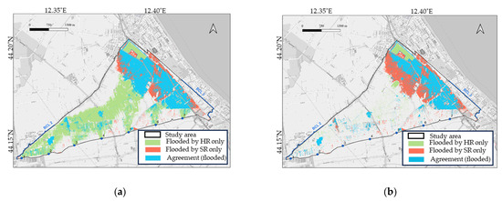 (a) Pixel-based comparison between inundated areas according to Safer_RAIN scenario SR_all and HEC-RAS inundation scenarios HR_7 max; (b) pixel-based comparison between inundated areas according to Safer_RAIN scenario SR_all and HEC-RAS inundation scenarios HR_7 end.