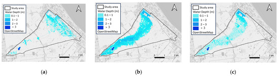 The flood maps present a qualitative representation of the extent of inundation and water depth across the study area. However, due to the inherent uncertainty of Safer_RAIN, only pixels with a water depth exceeding 0.1 m are considered to be flooded. This approach takes into account the uncertainty associated with the simulation results and ensures a conservative assessment of the flooded areas.