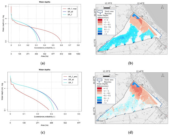 (a) Simulated water depth distributions between HR_7_max, SR_all and SR_7. (b) Water depth differences between SR_all and HR_7_max. (c) Simulated water depth distributions between HR_7_end, SR_all and SR_7. (d) Water depth differences between SR_all and HR_7_end.