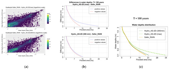 Figure 10b,c depict the distribution of simulated water depth and differences in simulated water depth across the study area. These differences are calculated on a pixel-by-pixel basis, distinguishing between positive and negative variances. Each graph represents the area (in hectares) where simulated water depths or their differences are greater than or equal to a certain value. Figure 10c contrasts the simulated inundation water depths for a 100-year event produced by Safer_RAIN and Hydro_AS-2D five hours into the inundation event, as well as the maximum values generated by the hydrodynamic model. Focusing on water depths over 20 cm, a common threshold of uncertainty in hydrodynamic simulations, the distributions of simulated water depths are strikingly alike, including the overall extent of inundation. The output from Safer_RAIN is nearly identical to Hydro_AS-2D in terms of water depth distribution. This similarity extends to the distribution of differences in simulated water depths. However, Figure 10b,c reveal that despite the overall similarity of simulated water depth distribution between the two models, there can be considerable local variations. It is also important to note that differences greater than 1 m are quite rare across the study area. The results obtained for a return period of 20 years are very similar and are not reported here for the sake of conciseness.