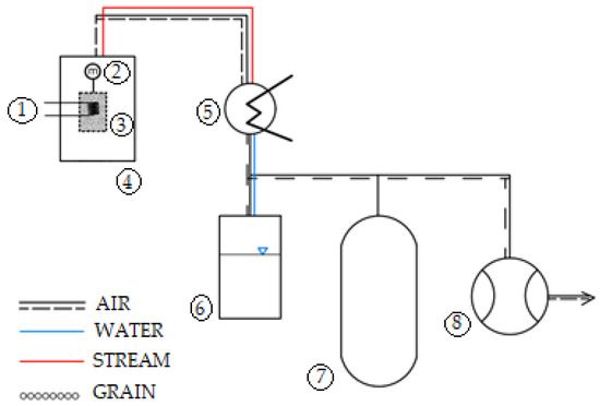 Diagram of the simplified physical model of a vacuum dryer [38], where 1—electric heating, 2—tensometric balance, 3—perforated basket for the grain, 4—vacuum chamber, 5—condenser, 6—condensate tank, 7—vacuum air reservoir and 8—vacuum pump.