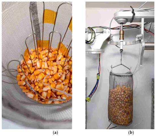 The corn sample (Figure 2) was placed in the perforated basket at an mc1 of 1300 g, the temperature tc1min was in the range of 16 °C to 21 °C and the moisture content wc1 was determined. In the basket, a temperature sensor was placed at the middle height of the sample to continuously detect the temperature of the corn sample.