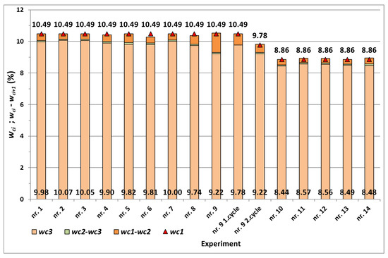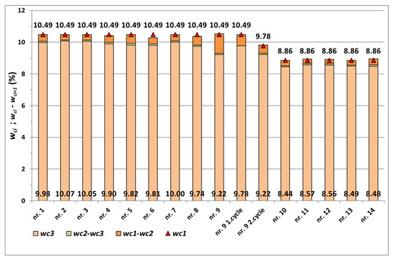 The calculated moisture values wc1, wc2 and wc3 of the corn samples during vacuum drying for measurements no. 1 to no. 14 are summarized in Table 4. The moisture values wc1 at the beginning and wc3 after the completion of vacuum drying for the individual measurements are shown in Figure 3. The difference in humidity wc1–wc2 was determined from the moisture content during the heating of the corn sample and the moisture content during the evaporation of water from the grains in the vacuum chamber, and wc2–wc3 was determined from the moisture content when the sample was removed from the vacuum chamber and the moisture content at the end of drying the sample on the sieve. In Table 4 and Figure 4, the difference in humidity wc1–wc3 as and the relative difference are given for the reference corn samples.