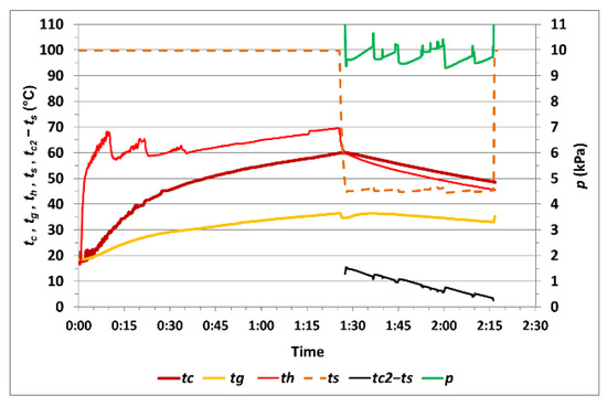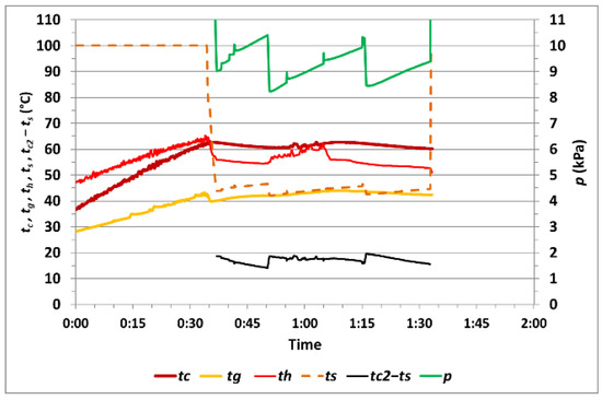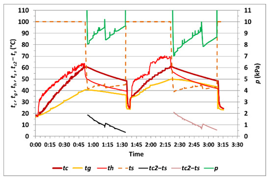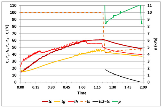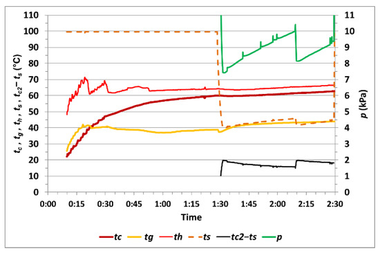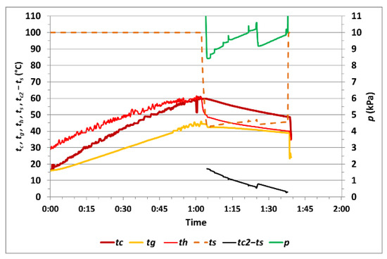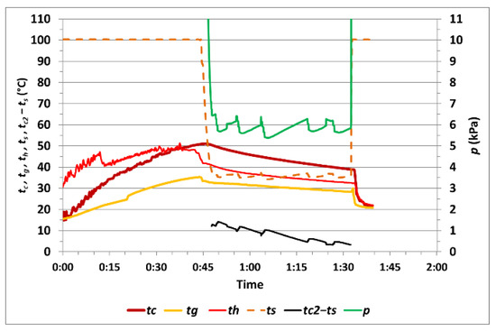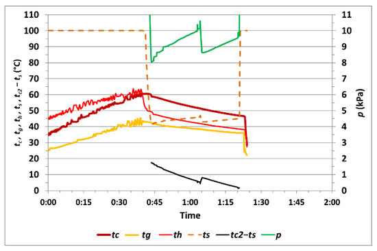 The course of the measured values during measurement no. 5 with one cycle of vacuum drying is shown in Figure 12. The temperature tc1max at the end of heating rose to 60.6 °C, and, during vacuum drying, the temperature tc2min was 48.4 °C, while the temperature difference (tc2–ts)min was 0.6 °C. Vacuum drying of the corn sample took 0:34 h. The calculated difference in moisture was 0.66%, and the relative moisture difference was 6.32%.