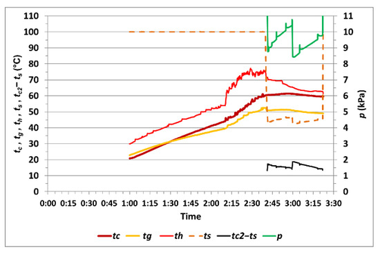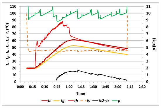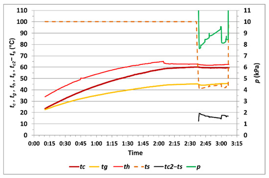 The courses of the temperature tci of the corn samples placed in a perforated basket, tgi of the selected corn grain, thi of the electrically heated coils, ts of water saturation, temperature difference tc2–ts during vacuum drying, pressure pi in the vacuum chamber during the heating of the corn samples and the evaporation of water from the grains during measurements no. 1 to no. 14 are listed in Table 1 and shown in Figure 6, Figure 7, Figure 8, Figure 9, Figure 10, Figure 11, Figure 12, Figure 13, Figure 14 and Figure 15. The values of these variables were recorded in 5 s intervals.