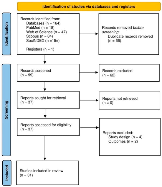 A total of 164 articles were identified by searching four databases: PubMed (n = 18), Web of Science (n = 47), SocINDEX (n = 15) and Scopus (n = 84) (see Figure 1). One additional article was identified through a manual search. After removing duplicates (n = 65), 99 records were identified. After screening the titles and abstracts, 37 full texts were assessed for eligibility, of which 31 articles met the inclusion criteria and were included in this systematic review, published between 2012 and 2022 [22].