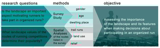 There is evidence confirming the high pro-health value of physical activity taking place outdoors, especially when surrounded by greenery. It seems obvious that the primary reason people take up running is to care for their health and well-being and develop physical fitness [31,32,33]. It was also confirmed that running events have been important social events for many years, in which not only the runners themselves participate but so too do local organisers, volunteers, fans and spectators [34]. If we want to promote running, which is an activity that does not require financial outlays and can be practiced almost anywhere, it seems important to look for additional arguments relevant to people taking up this activity or planning to start it. Our literature review shows that respondents appreciate the environmental values of trails, but there is no detailed research on this subject, which is why this aspect is the essence of our research. The main research problem was assessing the importance of the landscape when making decisions about participating in an organised run. We asked ourselves and the people to whom we sent the surveys the following questions: Is the landscape an important aspect motivating you to take part in organised runs? What landscape values of the routes of running competitions determine their popularity? We were also interested in whether landscape values were equally important to all respondents, regardless of gender, age and place of residence (Figure 1). In addition, the implementation of our research allows us to formulate guidelines that can be helpful to landscape architects, planners and organisations involved in shaping competition running routes and promoting an active lifestyle.