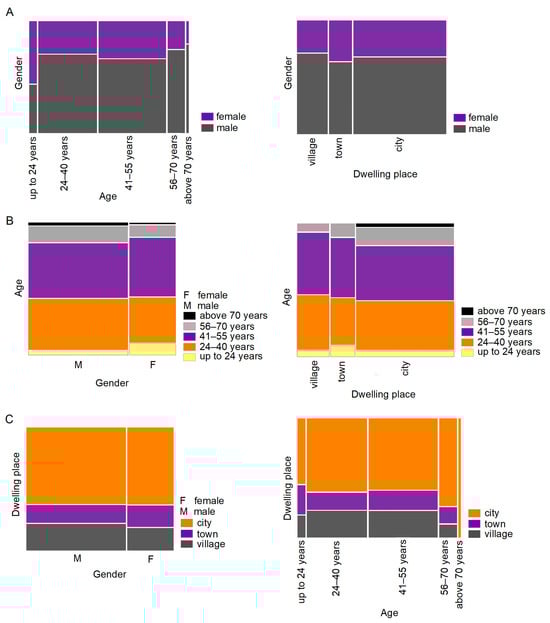 The analysis of the graphs, as well as the results of the frequency analysis, indicate that the importance of the landscape criterion when choosing a run does not depend on the runner’s place of residence (χ2 = 13,579; p = 0.093) and age (χ2 = 17,797; p = 0.539). However, the results show a certain tendency—the older the runners, the more they appreciate the advantages of the routes they run on. About 37% of city dwellers choose running with an interesting landscape, but if they do, 67% of them always admire it while running. Significantly fewer rural residents, although still a lot (61%), are interested in the surrounding nature while running (χ2 = 17.295; p = 0.002) (Figure 4C).