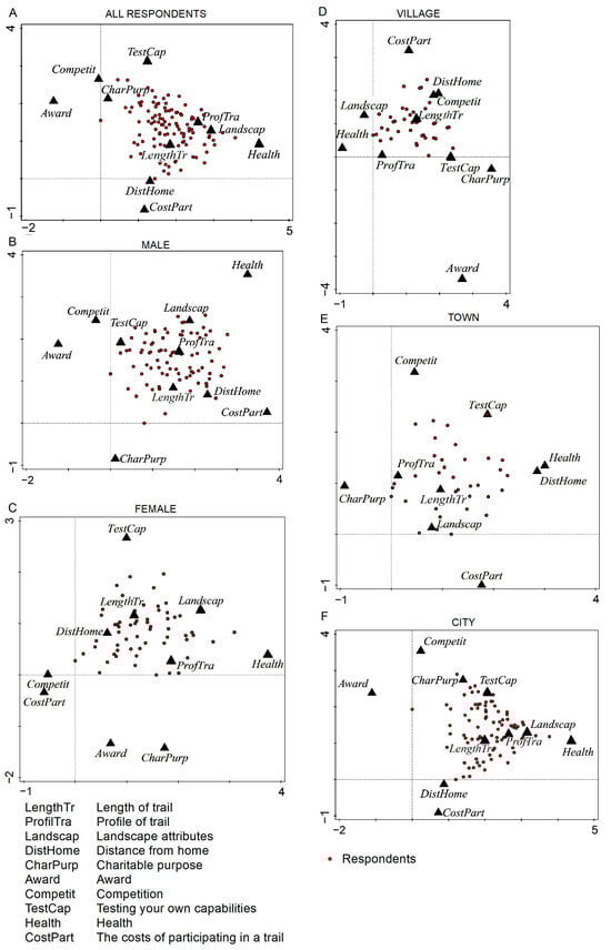 Route choice was dictated by various factors. When choosing a run, the respondents were mainly guided by the trail profile (186 people), and this was more important for men. A total of 163 people also chose running routes characterised by high landscape values, mainly those living in cities and towns. The next was the length of trail, regardless of gender and place of residence. Women decided to participate in trail runs when taking into account practical criteria such as distance from home as well as difficulty expressed in length and profile. Unlike men, self-testing was not an important factor they considered. When choosing a run, the respondents were also guided by health aspects, especially city dwellers. For runners, both women and men, and regardless of where they lived, irrelevant factors were award as well as cost. For some villagers, the opportunity to compete was important. Few considered charity purpose (Figure 3A–F).