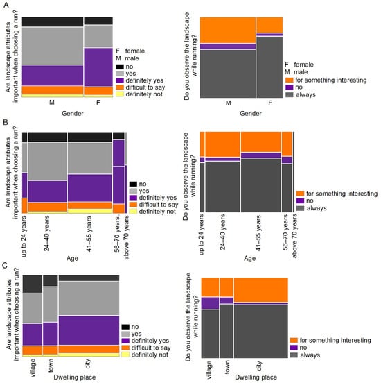 Running activity in the context of landscape values of routes in relation to gender (A), age (B) and place of residence (C).
