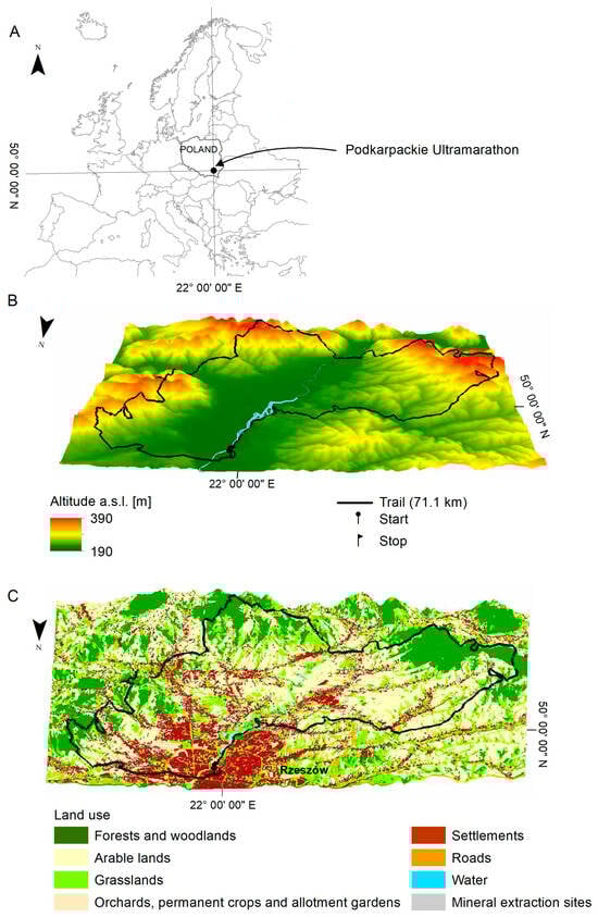 Extended spatial analyses were conducted for the Podkarpackie Ultramarathon (UP), which was among the most frequently chosen by respondents. It combines features typical of both urban street running and rural trail running, spanning through a city of nearly 200,000 inhabitants and various surrounding landscapes and landforms. Detailed analyses including assessments of changes in land use concerning the topography, visibility and exposure are presented in Section 3.4.