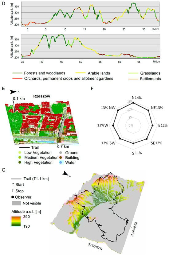 Relief and land development along the route of Podkarpackie Ultramarathon: (A) Location. (B) Terrain model. (C) Three-dimensional land use model. (D) Longitudinal profile of the route, taking into account land development. Use of colours according to the legend Figure 2C. (E) Classification of the LiDAR point cloud along the route within the centre of Rzeszów. (F) Route exposure. (G) Visibility from the selected waypoint.