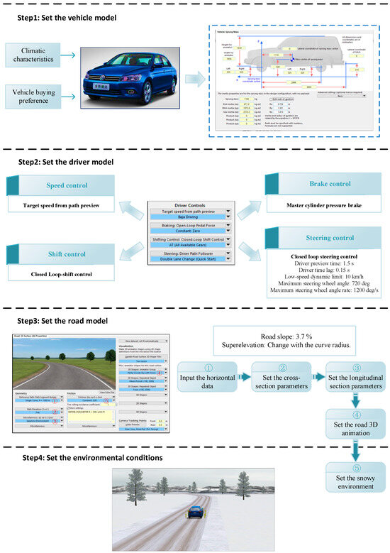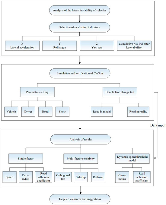 The research community has paid close attention to road traffic safety in snowy and icy conditions [15]. Based on crash data, many studies have found that the frequency of traffic crashes suddenly increases after snowfall in the winter, causing serious injuries to the occupants [16,17]. Researchers have constantly focused on studying the incidence rate of crashes in snowy weather and the severity of collisions using crash data [16]. According to crash statistics, road traffic crashes occur at a significantly higher rate and cause more extensive damage in wintry conditions than in normal weather conditions [18]. These incidents, in particular, cause injuries and property damage that are several times larger than those seen in normal weather. To reduce the impact of crashes, researchers have developed models and algorithms that use crash and weather data for analysis and prediction. These models and algorithms can be used to predict risk prior to the arrival of snow and ice or to implement various road maintenance strategies to ensure the safe operation of vehicles in wintry conditions [15,19], thereby reducing collision rates [20]. Although these research efforts have had a positive effect on crash occurrence rates, they are still some way from achieving the ultimate goal of lowering crashes to a greater extent. In order to successfully reduce the frequency of such incidents, there is an urgent need to examine the driving characteristics of vehicles on snow and ice, as well as the underlying mechanisms that contribute to crashes. Due to the minimal tire-to-road friction under such conditions, vehicles involved in collisions are prone to sideslips or rollovers. Such incidents occur when drivers lose control of their vehicle’s trajectory, and the resulting rapid shift in trajectory is the direct cause of crashes and rear-end crashes involving numerous vehicles. As a result, the destabilization of a vehicle’s lateral state on snowy and icy roads is an important consideration. Nonetheless, research on vehicle sideslips and rollovers in snowy and icy situations is severely lacking. Furthermore, the lack of appropriate driving practices and safety measures for such conditions makes it difficult for drivers to manage their vehicles on snow and ice. Given this, the focus of this research is on vehicles traveling in snowy and icy conditions. A road in Jiamusi City, Heilongjiang Province, China, known for its cold and snowy weather, served as the research backdrop using CarSim (2019.0) vehicle dynamics simulation software to establish a driver–vehicle–road model to reproduce various scenarios of vehicles driving in snowy and icy weather, and explore the restrictive factors and mechanisms that affect the lateral stability of vehicles, quantitatively analyze the relationship between sideslip and rollover and the influencing factors, explore the interaction mechanism of multiple factors during driving, and reveal the characteristics and laws of crashes to improve the safety of vehicles driving in snowy and icy weather. The aim of this study was to find ways to effectively reduce the traffic accident rate and improve the traffic safety status of extreme weather on the whole. The rest of the paper is organized as follows. Section 2 reviews previous related research. Section 3 introduces the simulation approach and strategy. Section 4 analyzes the simulation results. Section 5 discusses the importance of influencing factors and the focus of attention on improving driving safety. Finally, Section 6 summarizes and proposes future research directions. The research flow chart is shown in Figure 1.