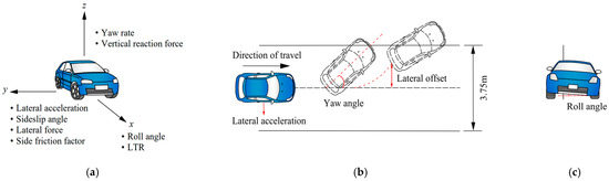 Numerous evaluation indicators are employed in the simulation and field test to measure the lateral stability state of the vehicle while traveling. Table 2 summarizes the evaluation indicators used in current literature to provide a summary of historical research. In the studies cited, the most commonly used indicator is lateral acceleration, followed by yaw angle, roll angle, sideslip angle, lateral force, load transfer ratio (LTR), lateral offset, and tire vertical reaction force. These indicators are distributed in a three-dimensional dynamic coordinate system to assess the vehicle’s operating state from multiple directions, effectively defining the sideslip and rollover tendency. The coordinate system is centered on the driver, with the X-axis indicating front and rear vehicle movement, the Y-axis representing left and right lateral directions perpendicular to the vehicle’s motion, and the Z-axis representing the vertical direction of the vehicle’s plane. As shown in Figure 2a, this forms a three-dimensional coordinate system to characterize the vehicle’s movements. To characterize the vehicle’s state, the roll angle and LTR are used as motion indicators along the X-axis direction. The roll angle indicates the vehicle’s inclination toward the ground as it travels around a curve. Rollover is possible if the roll angle is high enough because there is an increase in load on one side of the front and rear axles’ wheels during vehicle roll and a decrease in load on the other side. Therefore, LTR can also be used to reflect the load transfer caused by rollover and evaluate the rollover risk. The Y-axis indicators of lateral acceleration, sideslip angle, lateral force, and side friction factor characterize the vehicle’s motion state. When traveling around a curve, the vehicle generates a lateral force perpendicular to its motion, and the side friction given by the road may be insufficient to resist this lateral force. As a result, there is a large lateral acceleration and sideslip angle, which can lead to vehicle sideslip. As a result, these indications accurately describe the vehicle’s likelihood of sideslip. Yaw rate and tire vertical reaction force are Z-axis evaluation indicators. The magnitude of the yaw angle represents the vehicle’s rotational deflection angle around the vertical axis. An uneven distribution of vertical reaction force between the front and rear axles, as well as the left and right tires, might increase the likelihood of a rollover. These indications can also be categorized based on the two types of lateral crash states that occur while driving a vehicle. Sideslip can be indicated by lateral acceleration, sideslip angle, lateral force, and side friction factor, whereas roll angle, load transfer ratio, yaw rate, and vertical reaction force describe the vehicle’s rollover state. Some indicators, such as lateral acceleration and side friction factor, are relatively complete, defining both vehicle states at the same time. Based on research findings in the relevant literature and the functions of each evaluation indicator, we selected some representative and most frequently used evaluation indicators indicating the vehicle’s motion state in each direction for our investigation. Roll angle, lateral acceleration, and yaw rate are the indications in the X-, Y-, and Z-axis directions, respectively. Furthermore, in addition to real-time vehicle dynamics, we should also consider the cumulative risk indicators of the vehicle. We chose the lateral offset [62], which reflects the vehicle’s trajectory deviation and intuitively depicts the vehicle’s sideslip tendency. These four indicators will be used in future studies. Figure 2b,c illustrate the chosen indicators.