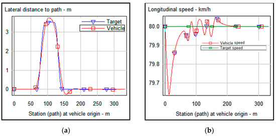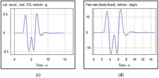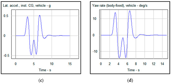 In addition to evaluating the selected vehicle’s motion state during the traveling process in each direction, it is critical to determine the threshold values for these indicators when the motion state changes. These thresholds serve as warning indicators that the vehicle has deviated from its regular traveling state and is at risk of a sideslip or rollover incident. These threshold values were determined using China’s “Limit Values and Evaluation Methods of Automobile Maneuvering Stability Indicators” (QC/T480-1999 [71]), which included steady-state slewing and serpentine tests, among other procedures. This study refers to ISO 3888-2:2011 [72], EU Regulation 661/2009 [73], and prior studies by scholars when considering the influence of vehicle parameter fluctuation on evaluation indicator thresholds [26,35,48,74,75,76]. The determined thresholds are: for lateral offset, 0.3 m, for lateral acceleration, 0.4 g, for yaw rate thresholds, 25 deg/s (60 km/h), 17.5 deg/s (80 km/h), and 10 deg/s (100 km/h), and roll angle thresholds, 1.2 deg (60 km/h), 0.95 deg (80 km/h), and 0.7 deg (100 km/h). These evaluation indicator thresholds will help in identifying changes in the operational state of the vehicle during the simulation analysis.