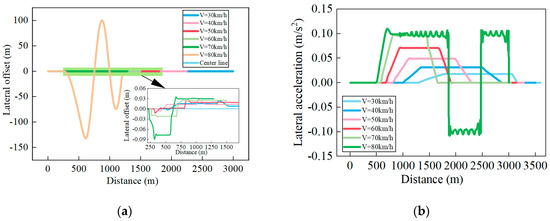As shown in Figure 7a, at lower speeds, the total force on the vehicle remains balanced, and the lateral offset approaches 0, indicating a stable operational state. When the speed approaches 80 km/h, the vehicle encounters a substantial sideslip, resulting in instability. A localized magnification figure for speeds ranging from 30 to 70 km/h is given to provide an extensive overview of the lateral offset fluctuation with speed. Within this range, the vehicle enters the curve in the road with a slight right offset, then a slight left offset, and eventually remains stable. The lateral offset gradually increases with vehicle speed, although only by a small amount, and the curves remain essentially consistent. At 70 km/h, the maximum lateral offset is 0.090 m, which is much less than the threshold value of 0.3 m. This result indicates that the vehicle will not encounter sideslip and will be capable of maintaining safe driving conditions. At 80 km/h on a straight road, the lateral offset is virtually 0. This phenomenon may be caused by the vehicle’s balance of gravity and support force, resulting in no change in direction and ensuring that the vehicle remains centered within the controlled range. However, as soon as the vehicle enters the curve, it constantly modifies its driving trajectory for safety. Despite these efforts, the lateral force on the wheels is inadequate to resist the greater centrifugal force, resulting in considerable deflection on both the left and right sides, loss of vehicle control, and sideslip.