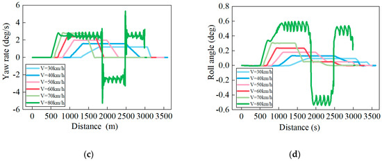 As seen in Figure 7b,d, the trends in each curve are nearly the same. When the vehicle speed is between 30 and 70 km/h, it will not produce a centrifugal force on a straight road, and the lateral acceleration, yaw rate, and roll angle will be close to 0 with little variation, allowing the vehicle to travel stably. When the vehicle entered the curve, its operating status changed, with the lateral acceleration, yaw rate, and roll angle increasing linearly until each indicator stabilized, while maintaining constant lateral acceleration, yaw rate, and roll angle [82]. Subsequently, when the vehicle exited the curve, the indicators began to decrease linearly until the vehicle re-entered the straight, at which point the indicators recovered to roughly 0. It is worth noting that, on a curved road, the vehicle speed positively correlates with the rate increase in each indicator over the same section length due to the presence of centrifugal force. Furthermore, faster speeds result in higher peak values and shorter curve durations. At speeds ranging from 30 to 70 km/h, the maximum values of lateral acceleration are 0.018 g, 0.032 g, 0.050 g, 0.071 g, and 0.098 g, respectively. Similarly, the maximum values of the yaw rate are 1.194 deg/s, 1.594 deg/s, 1.997 deg/s, 2.046 deg/s, and 2.844 deg/s, respectively. Additionally, the maximum values of roll angle are 0.096 deg, 0.133 deg, 0.180 deg, 0.238 deg, and 0.309 deg, respectively. None of these values exceed the sideslip and rollover thresholds, indicating the vehicle can properly complete the set simulation working conditions. As a result, the vehicle can pass through the curve at speeds ranging from 30 to 70 km/h on an icy road with a road adhesion value of 0.10. These conclusions, however, are based primarily on one aspect of the simulation result. Notably, at 70 km/h, indicators show a significant increase, indicating a significant tendency toward higher hazards. This is an important consideration.