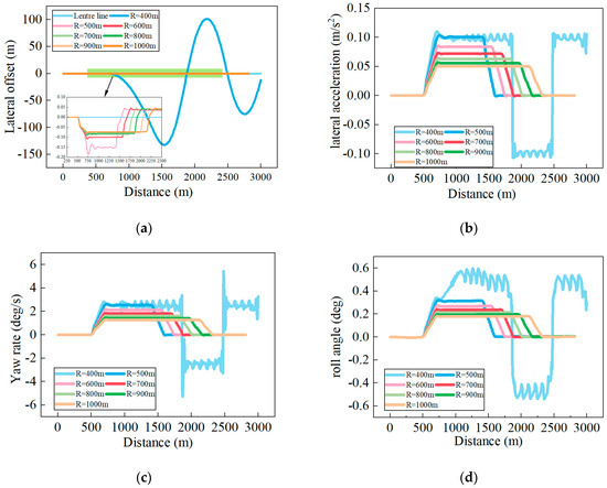 Simulation results under different curve radii. (a) Lateral offset; (b) Lateral acceleration; (c) Yaw rate; (d) Roll angle.