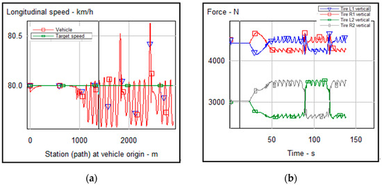 It is noteworthy that the decreasing points of lateral acceleration, yaw rate, and roll angle vary with the curve radius. Because of the higher curve radius and longer curve, the plots in the figure have a step-like pattern, resulting in a more backward-descending position. Clearly, each indicator remains below the safety threshold within this range, suggesting no risk of a sideslip or rollover. Furthermore, the simulation results demonstrate that the vehicle can navigate the designated road properly. The vehicle may be driven properly on the straight with a curve radius of 400 m. However, after entering the curve, the plots in the figure demonstrate frequent fluctuations and the maximum values of each indicator reach 0.126 g, 5.458 deg/s, and 0.596 deg. As a result, even though it does not approach the rollover threshold, the vehicle loses control and cannot handle the curve properly. Figure 9 demonstrates the longitudinal speed and tire vertical reaction force of a vehicle with a 400 m radius in CarSim. Figure 9a shows that the vehicle’s longitudinal speed fluctuates and deviates from the set speed at the curve, whereas Figure 9b shows that the wheels on both sides of the same suspension reach a balanced state and the tire vertical reaction force remains greater than 0, indicating no risk of rollover and consistent with the above analysis. To ensure that the vehicle passes safely, drivers should decelerate and slow down when passing through small radius curves and hold the steering wheel tightly and slowly, especially at the entrance to the curves.