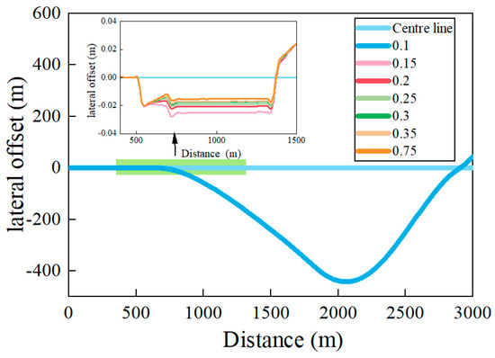 According to the observations in Figure 8a, the vehicle has about 0 lateral offset and maintains stable driving on a straight road. However, as the vehicle enters the curve, it experiences a rightward and then leftward offset until it completes the curved trajectory. The radius of the curve ranges between 500 m and 1000 m and has a low lateral offset along the whole road. A closer examination of the localized magnification figure demonstrates that gentler curves subject the vehicle to smaller centrifugal forces, allowing the lateral force to be efficiently counteracted, resulting in a shorter offset distance and increased safety. At the beginning of the 500 m radius curve, the vehicle has a maximum lateral offset of 0.185 m, which is lower than the threshold value of 0.3 m, indicating that no sideslip occurs. The simulation animation also shows that there is no risk of vehicle sideslip instability. However, with a curve radius of 400 m, the vehicle encounters extreme sideslip instability, resulting in a significant offset exceeding 100 m, preventing it from passing the designated route.