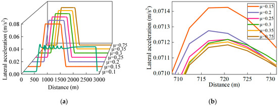 Lateral acceleration under different road adhesion coefficients. (a) Overall; (b) Localized magnification.