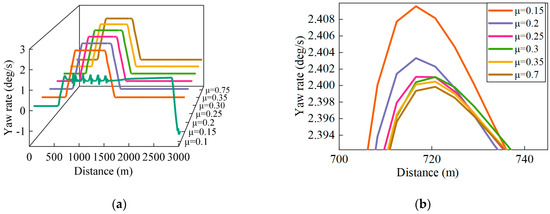 Yaw rate under different road adhesion coefficients. (a) Overall; (b) Localized magnification.