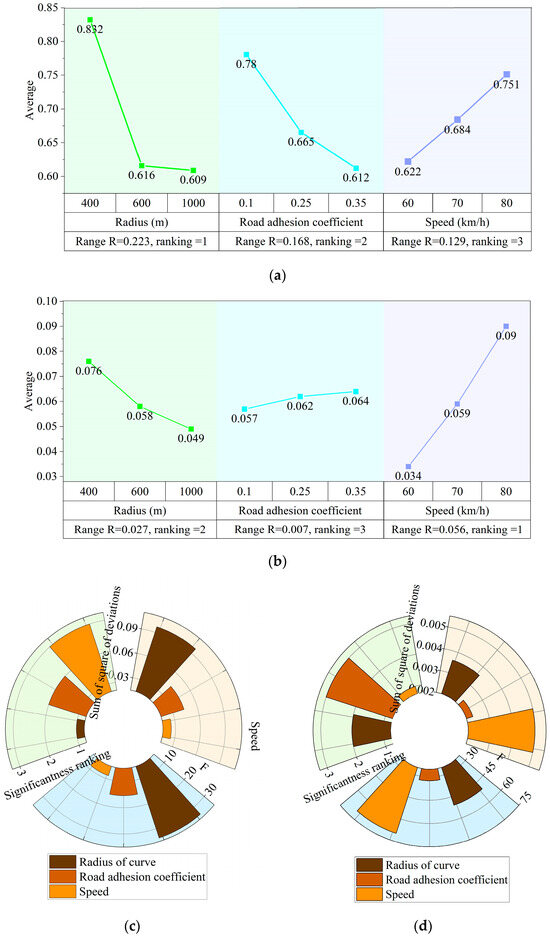 The study’s findings establish that decreasing vehicle speed, increasing road adhesion coefficient, or increasing curve radius can effectively decrease the vehicle’s lateral offset, lateral acceleration, yaw rate, and roll angle, which has a positive effect on preventing sideslip or rollover. The impact of influencing factors is not independent [62]. Vehicle rollover or sideslip is frequently influenced by multiple factors, resulting in a highly complex interaction mechanism. We used a three-factor, three-level orthogonal test to identify the most important impact factors. Curve radii of 400 m, 600 m, and 1000 m were used in the experiment, with road adhesion coefficients of 0.10, 0.25, and 0.35 representing ice road, snow slurry road, and loose snow road conditions, respectively. The speeds tested were 60, 70, and 80 km/h. The simulation made use of the previously specified road and vehicle models. Figure 14 illustrates the combined factor test findings obtained from the analysis of range and the analysis of variance (ANOVA).