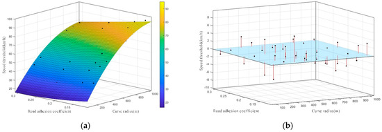 We conducted the following experiments to determine the dynamic speed limit values for various roads: For curve roads with a radius of 100–1000 m, 1000 sets of random numbers representing road adhesion coefficients were generated. The critical speeds at which vehicles failed to pass through the established working conditions for the first time under various snowy and icy road conditions were then determined using simulation tests. Table 5 summarizes the results. Based on the findings in Table 5, we developed a model for calculating the dynamic speed threshold under various conditions (Equation (10)), with curve radius and road adhesion coefficient as independent variables.