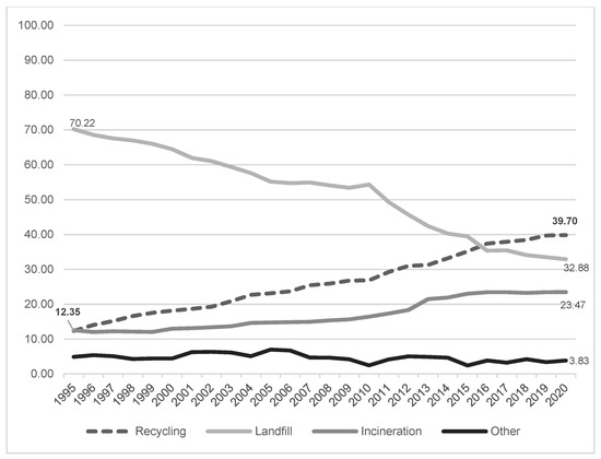 In general, the average recycling rate of MSW as a share of the total managed MSW in the EU27 countries has grown steadily over the last 25 years, from 12.3% in 1995 to 39.7% in 2020. Figure 1 illustrates the main waste management patterns in the EU27 countries. The average landfill rate of MSW experienced an important reduction in the past 25 years, from 70.2% of the total MSW in 1995 to 32.9% in 2020, while the average incineration rate has increased, but at a relatively slower rate compared to the recycling rate, reaching 32.9% of the total MSW in 2020.