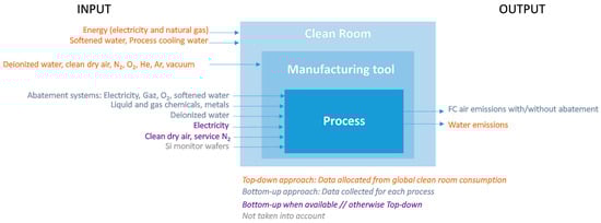 Working in a clean room environment contributes to large electricity, natural gas and water consumption for climate and humidity control, with overpressure and particle filtration, extensive subfab facilities for gas abatement, exhaust pumps, water chillers, and water purification. Therefore, a specific methodology is needed for the LCA of a semiconductor device, taking into account processing, maintaining the manufacturing tools ready for process (also called “idle mode”) and maintaining a clean room infrastructure [12]. An hybrid top-down and bottom-up approach was used for this life cycle inventory (LCI) [13,14].