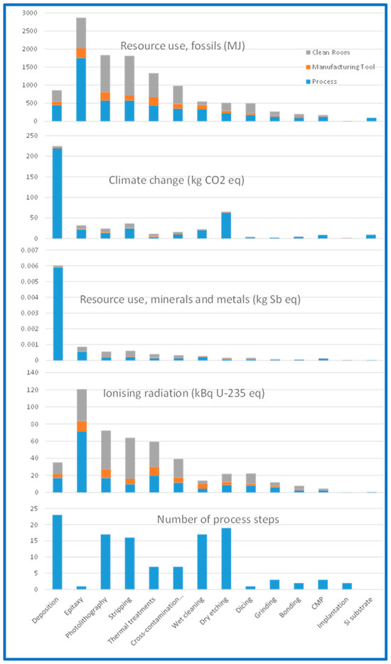Main environmental impacts and number of process steps for the processing of a 200 mm GaN/Si MOSc-HEMT wafer presented by process category and by contribution (process, manufacturing tool and clean room.