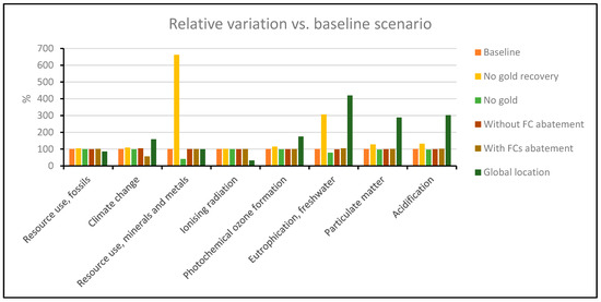 The impacts are calculated for a scenario with no gold recovery during the PVD deposition step (i.e., consumption of 0.931 g of gold). After normalization and ponderation, the following impact categories are selected: resource use, minerals and metals; resource use, fossils; and climate change, accounting for 82% of the unique score (total of 128 mPt, see Table 4). Gold material is typically used to reduce the electrical resistance, and, in some cases, it might be replaced easily by other metals. Here, since gold is used for the backside metallization, there is no strict requirement for a low resistance, and therefore gold could be replaced by another die-attach material, for instance by silver or aluminum, depending on the chosen packaging technology. The impacts are also calculated for a scenario with no use of gold at all (i.e., consumption of 0 g of gold). After normalization and ponderation, the following impact categories are selected: resource use, fossils; climate change; ionizing radiation; resource use, minerals and metals; and photochemical ozone formation, accounting for 83% of the unique score (total of 48.2 mPt). A variation in the amount of gold used in the processing leads to a large variation in the impacts on resource use, minerals and metals, here from +563% to −58%, as illustrated in Figure 4. Due to high impacts of gold material, the consumption of gold for semiconductor manufacturing should be calculated accurately for representative impact assessment. In case of replacement by another metal, the environmental impacts should be calculated with adjusted metal thickness to obtain the desired resistance.