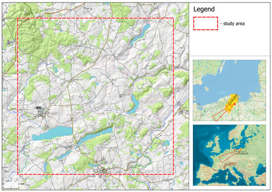 The study was conducted on a 10 km × 10 km research area in the northern part of Poland, i.e., Gdańsk Pomerania. The study area was located in the Kashubia cultural region (Figure 1).