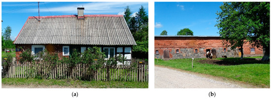 The building development of old, dispersed farmsteads had traditional, recognizable formal features, such as a small scale and a concentration of houses with 1–3 farm buildings. These developments were usually located around a rectangular farm yard. The architectural features of Kashubian farm buildings have been shaped by the regional folk tradition, as well as by Prussian economic and social policy. Houses were traditionally built of wood; they mainly had a frame structure filled with clay or, under Prussian jurisdiction, with brick. They were one-story and squat, with a high gable roof. Alternatively, they were two-story with a gable roof with a very small slope [30,31]. Livestock buildings were built of brick and stone (Figure 3). Tall barns were erected of wood.
