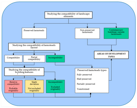 - The classification of old farmsteads according to the degree of preservation of their original substance, as well as the division of the study area depending on the development type.