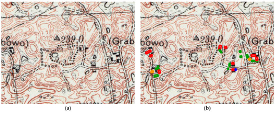 Results of the comparison of the map content in QGIS 3.22. (a) Archival map from 1937, 1: 10,000. (b) Archival map from 1937 with buildings from the 2020 database and their dating assessment. Probable original buildings: