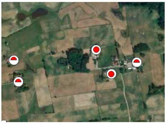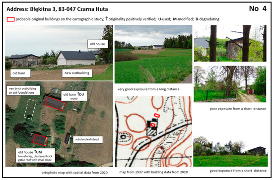 Despite the use of auxiliary sources and the multi-level interpretation in accordance with Figure 4, it was impossible to determine with certainty that the buildings on the archival and the contemporary maps were identical. Hence, the research resulted in indicating buildings that were likely original (with full compatibility of the position of the farmstead relative to the neighboring elements on the map, a high degree of compatibility of the position of the building in the farmstead layout, and relative compatibility of recognizable architectural features) and buildings whose originality could not be excluded (with full compatibility of the position of the farmstead relative to the neighboring elements on the map, limited compatibility of the position of the building in the farmstead layout, and slight deviations in its architectural features). Elements of certainly more recent origin and absent from the archival maps were also indicated (Figure 5).